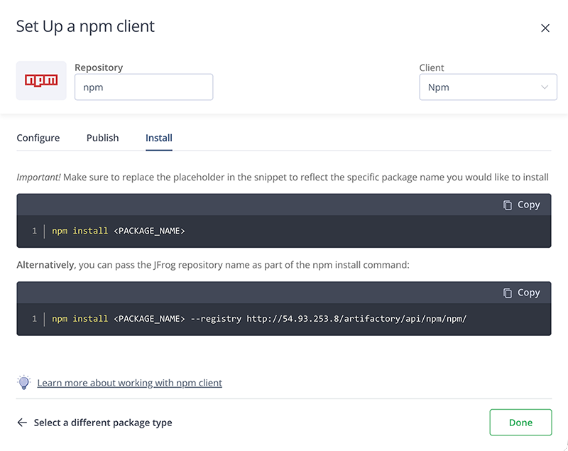 Here’s an example of how JFrog Artifactory documents client configuration for the NPM registry: